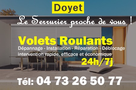 Nous mettons à votre disposition des réparateurs de volet roulant à Doyet, disponibles 24h/24 et tous les jours, n’hésitez pas à nous contacter pour l’installation ou le dépannage de vos volets roulants.