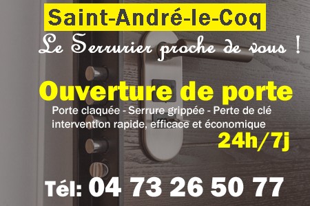 Besoin d’un serrurier en urgence à Saint-André-le-Coq ? Notre serrurier se déplace à votre domicile ou à votre magasin en moins d’une demi-heure 7 jours sur 7 de jour comme de nuit 24h/24, nous sommes ouvert le dimanche.